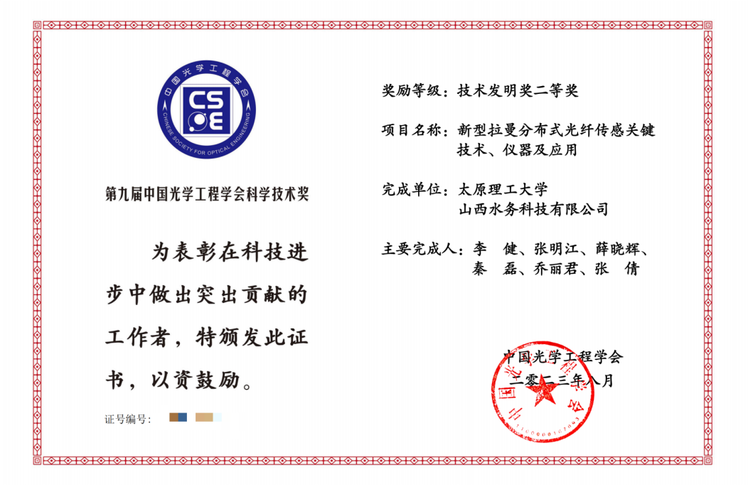 近日,第九届“中国光学工程学会科技创新奖”评选结果揭晓,beat365正版唯一官网物理学院张明江教授团队申报的“新型拉曼分布式光纤传感关键技术、仪器与应用”研究成果通过多轮严格评审,荣获“中国光学工程学会科技创新奖”技术发明二等奖(获奖人:李健、张明江、薛晓辉、秦磊、乔丽君、张倩)。